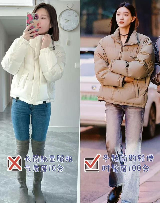 2.上宽下收——工装羽绒+微喇/直筒牛仔,裤脚微堆,靴子藏进裤管,雪水倒灌也防。