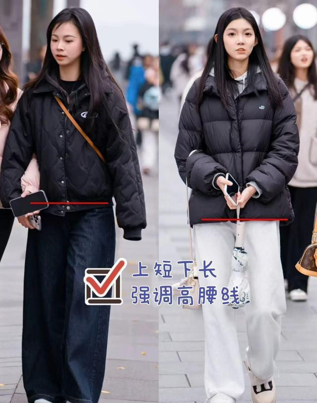 3.高腰线——把羽绒拉链拉到顶,再扯出一条皮带,扣子卡在胃的位置,胸以下全是腿。